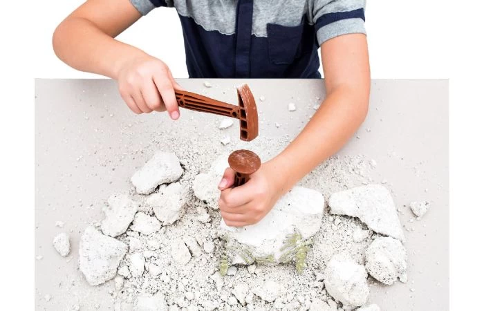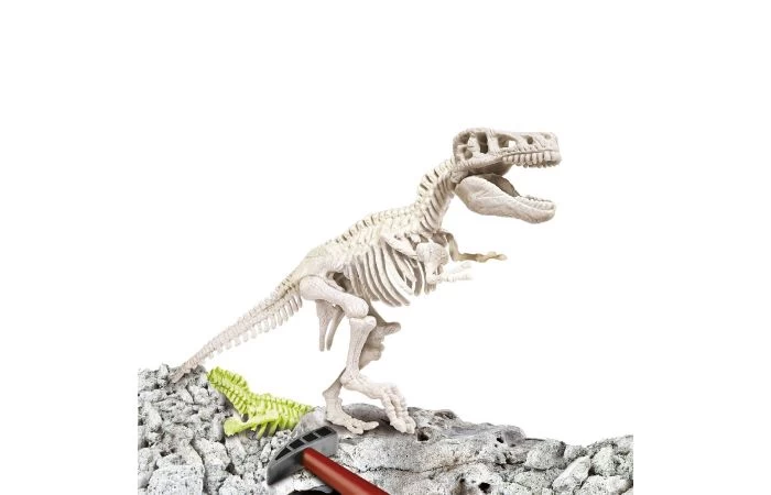 Zet zijn glow-in-the-dark skelet zorgvuldig in elkaar en breng deze niet te evenaren wreedheid weer tot leven! De kit bevat een hamer en een beitel om een echte paleontoloog te worden! Geschikt voor kinderen vanaf 7 jaar.