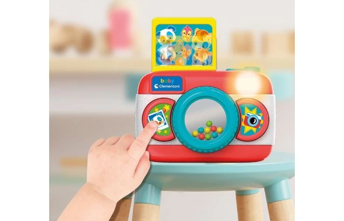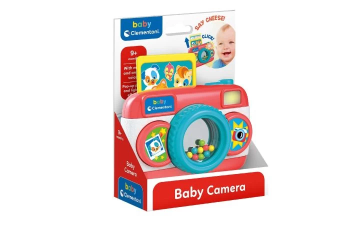 Clementoni activity camera, die bij elke foto schattige deuntjes of grappige diergeluiden laat horen. Met kleurige schakelaars die geluiden of liedjes activeren en baby’s door boeiende interactieve spelervaringen leiden, waarbij ze voortdurend op nieuwe manieren worden gestimuleerd. Behalve geluidseffecten, muziek en flitslicht, kleine fysieke interacties die niet alleen cognitieve vaardigheden maar ook de fijne motoriek ontwikkelen. Elke schakelaar, activiteit en materiaal is zorgvuldig ontwikkeld om het speelgoed gemakkelijk en boeiend te maken voor het kind. Als de ontspanknop wordt ingedrukt, klinken er geluidseffecten en muziek en verschijnt er een foto met pop-upeffect die beelden van de dieren laat zien. De lens van de camera bevat een kleine spiegel met kleurige knikkers die de aandacht van de baby trekken en hem of haar laat kennismaken met het concept van perspectief en diepte. Wordt inclusief 1 AAA-batterij geleverd. Geschikt voor kinderen vanaf 9 maanden.