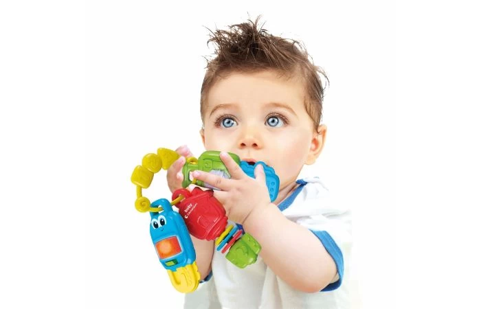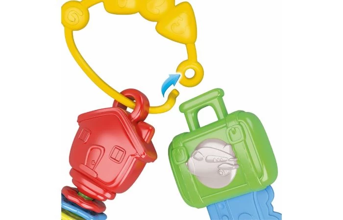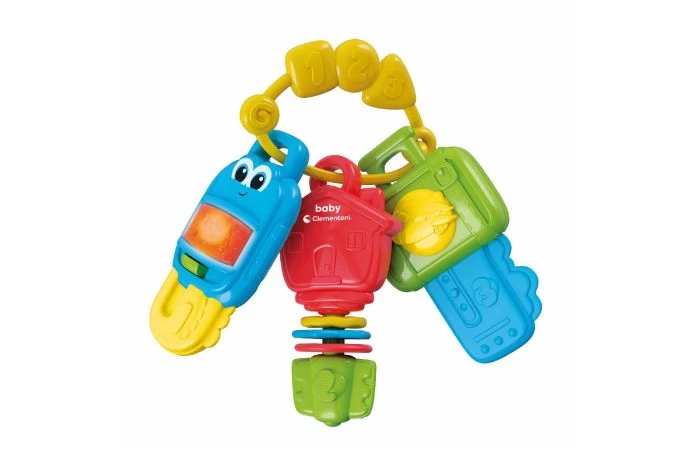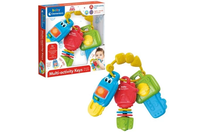 Clementoni speeltje dat het geluid nabootst van een elektrische sleutel, met leuke lichtjes en geluidseffecten. 3 speeltjes in 1: elke sleutel heeft een eigen activiteit om het gehoor, de aanraking en de handvaardigheid te stimuleren. Wordt inclusief 3 knoopcelbatterijen geleverd. Geschikt voor kinderen vanaf 3 maanden.