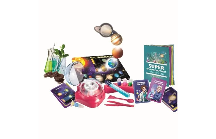 De set bevat experimenten, die meisjes nieuwsgierig zullen maken naar STEM-vakken. Achter veel ontdekkingen gaan namelijk vrouwelijke gezichten schuil: geestige en koppige wetenschapsters die belangrijke resultaten hebben bereikt! Meisjes zullen zich vermaken met hypotheses, gevolgen en resultaten en nieuwe wetenschappelijke concepten en benaderingen ontdekken. Inclusief centrifuge voor DNA-extractie en instrumenten om scheikunde- en biologie-experimenten uit te voeren. De set bevat ook zaden, turf en potten om de wereld van de plantkunde te ontdekken. Ook aanwezig in de set: glow-in-the-dark planeten, een puzzel die het zonnestelsel nabootst en kartonnen platen om de leuke kant van logica en coderen te ontdekken. Met handleiding om de geschiedenis en het leven van deze grote wetenschapsters te ontdekken. Wordt geleverd in full-colour doos. Geschikt voor kinderen vanaf 8 jaar.