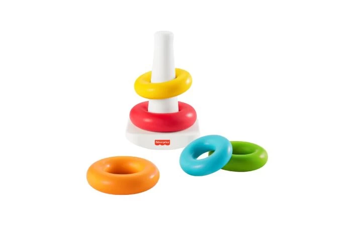 Deze Fisher-Price Kleurenringpiramide, gemaakt van plantaardige materialen, biedt kleintjes klassiek stapelplezier. De piramide heeft een wiebelige tuimelaarbasis en 5 kleurrijke ringen voor kleine handjes om te grijpen en te stapelen. Goed voor de ontwikkeling van de oog-handcoördinatie. Bij het van groot naar klein stapelen leert je baby over verschillende afmetingen. Minimaal 90 procent van het speelgoed is gemaakt van ethanol uit suikerriet. Wordt geleverd met kartonnen wikkel. Geschikt voor kinderen vanaf 6 maanden.
