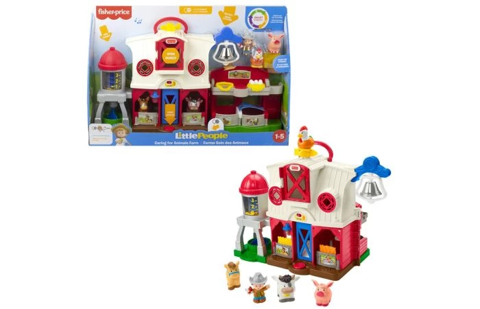 Met de Fisher Price Little People boerderij kunnen kinderen de boer helpen om voor al zijn dieren te zorgen: help de kuikens te voeren, zet het paard in zijn box en laat de zeug en de koe zien hoe ze om de beurt in de schuur komen waar het hooi wordt opgeslagen. En terwijl leerling-boeren spelen en ontdekken, laten leuke liedjes, zinnen en geluiden ze kennismaken met cijfers, kleuren, dierengeluiden en meer. Geschikt voor kinderen vanaf 1 jaar.