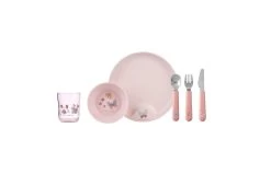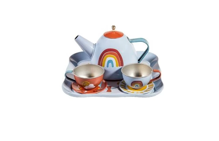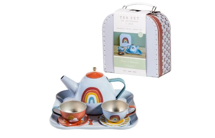 Trek in een kop thee? Pak het leuke picknickkoffertje uit en laten we een gezellig theekransje houden met dit tinnen speelgoed theesetje, geïllustreerd met schattige regenbogen en natuurlijke elementen. Rollenspellen zijn goed voor de fantasie van kinderen en de ontwikkeling van sociale vaardigheden. Het inschenken van vasthouden van de kopjes verbetert tevens de fijne motoriek. De set zit in een mooi koffertje en bestaat uit twee theekopjes, twee schotels, een dienblad, en een theepot met deksel. Geschikt voor kinderen vanaf 3 jaar.