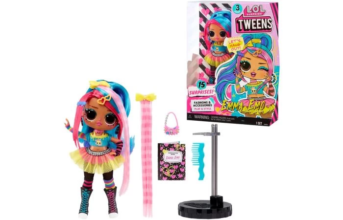 Maak kennis met de populaire LOL Surprise Tween-modepoppen van serie 3: hallo, Emma Emo! Emma is een sprankelende, energieke artiest die wordt aangetrokken tot alles wat fel, kleurrijk en schattig is. Ze combineert graag verschillende stijlen in haar kunst om onverwachte en gewaagde stukken te maken. Bovendien is ze de grote zus van de LOL Surprise-straatartiest Splatters. Pak 15 verrassingen uit, waaronder een Tweens-modepop, met een supermooi gezichtje, prachtig haar en haar eigen fantastische stijl. Elke doos is inclusief een LOL Surprise Tweens-modepop, een fenomenale outfit, accessoires, een haarborstel en een poppenstandaard. Deze LOL Surprise-modepoppen met stijlvol haar, outfits en veel accessoires met allerlei details zijn het perfecte speelgoed voor kids vanaf 4 jaar om fantasierijk te spelen!