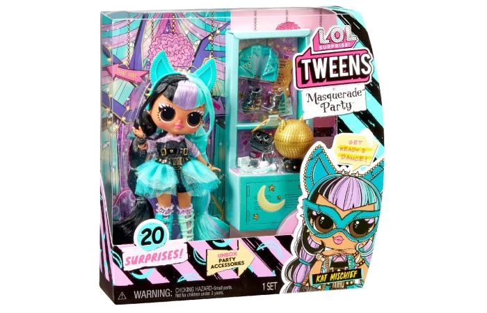 Je bent uitgenodigd voor de party van het jaar met de L.O.L. Surprise Tweens Masquerade Party-modepop Kat Mischief. Kat is de perrrr-fecte grappenmaakster. Met haar uitstekende socialemediaskills bereidt ze zich voor op een carrière als comedy-ster. Kat staat altijd klaar om te dansen. Trek haar het leren vest, de rok van tule en de laarzen aan en zet haar het masker op voor een tweede partylook. Pak 20 verrassingen uit, waaronder een Tweens-modepop met een supermooi gezichtje, prachtig haar en haar eigen punkrockstijl. Elke doos is inclusief een L.O.L. Surprise Tweens-modepop, een sprankelende jumpsuit, een leren vest, een overrok van tule, 2 paar schoenen, een veiligheidsspeld als oorbel, een handtas, een maskerademasker, een haarband met kattenoren, een make-updoosje, een make-upkwast, een armband, een discobol, een haarborstel en een poppenstandaard. Wordt geleverd in windowbox en is geschikt voor kinderen vanaf 4 jaar.