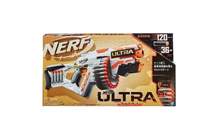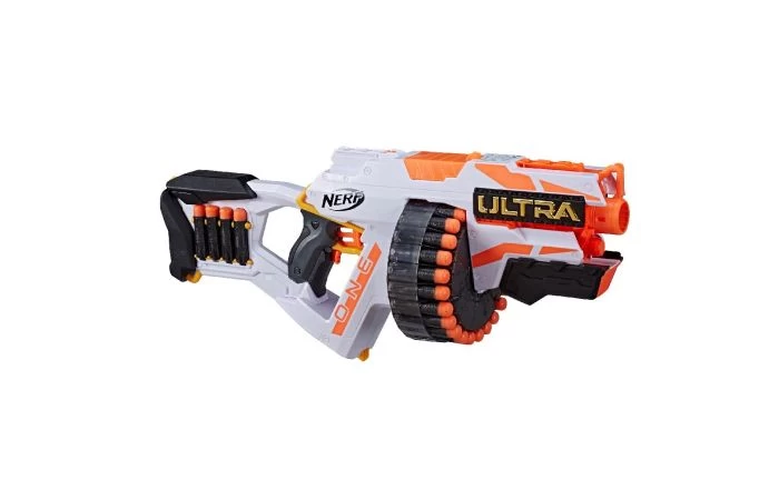 Ze bevatten grensverleggende Nerf Ultra-darts: de verst vliegende Nerf-darts ooit, met een innovatieve vliegpunt, Aerofin-technologie en Nerf Ultra-schuimrubber. Til je spel naar een hoger niveau met Nerf Ultra-blasters en darts! Nerf Ultra-blasters werken alleen met Nerf Ultra-darts. De gemotoriseerde Nerf Ultra One-blaster heeft een grote darttrommel voor 25 darts en wordt geleverd met 25 Nerf Ultra-darts. Vuur meer dan 2 dozijn darts af met de hoogwaardige voordelen van deze Nerf Ultra-blaster. Vuur de darts af tot op een afstand van 36 meter. De blaster is voorzien van een dartopbergruimte om snel te herladen. Wordt exclusief 4 C-batterijen geleverd. Geschikt voor kinderen vanaf 8 jaar.