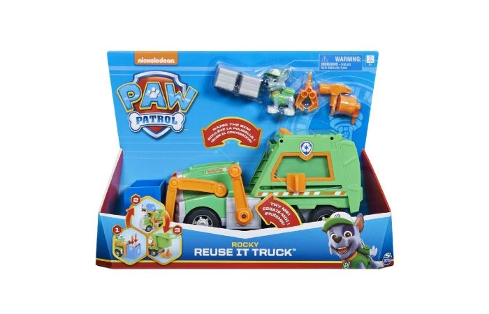 Met Rocky van PAW Patrol en zijn Re Use It Truck kun je materialen recyclen en er gereedschappen van maken! Plaats Rocky achter het stuur en rijd door de straten van Avonturenbaai, op zoek naar voorwerpen om te recyclen. Schuif de afvalcontainer op de armen van de truck, stop de metalen blokjes erin (twee stuks meegeleverd), duw de hendel van de truck omlaag om de armen omhoog te brengen en kijk hoe de afvalcontainer de blokjes in de truck gooit. Schuif dan de knop aan de zijkant van de Truck om te gluren naar de pers door het zijraam. Als de truck klaar is met recyclen, veranderen je metalen blokjes in drie handige gereedschappen die op de armen van de truck kunnen worden geklemd. Verwijder de afvalcontainer en plaats maximaal twee gereedschappen tegelijk. Veeg de straten schoon met de borstel, pak afval op met de klauw en voer reparaties uit met de hamer. Je kunt de armen draaien om op nog meer manieren te spelen. Geschikt voor kinderen vanaf 3 jaar.