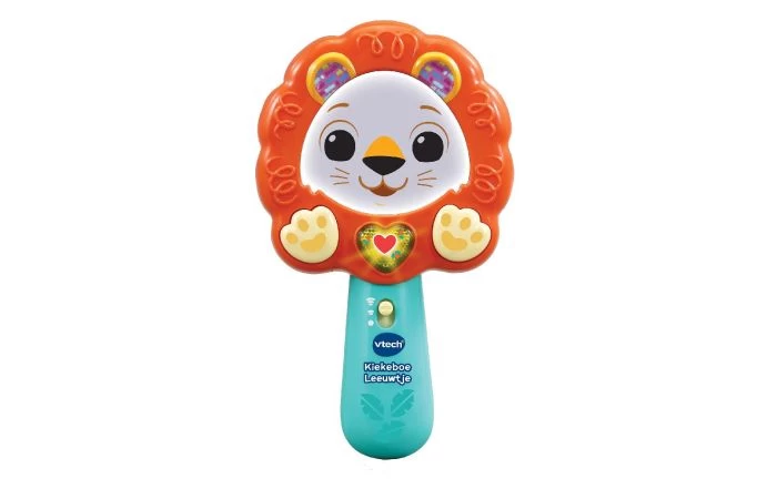 Speel kiekeboe met Brullie de leeuw! Speel een kiekeboe-spelletje met Brullie en zie hoe hij telkens weer verschijnt en verdwijnt. Druk op de hart-toets om Brullie op het spiegeltje te laten verschijnen en vrolijke reacties te horen. Druk op de poot-toetsen om grappige geluiden, vrolijke zinnetjes, gezongen liedjes en melodietjes te horen. Het handvat is speciaal gemaakt voor kleine handjes. Met 10 melodietjes en 4 gezongen liedjes, Nederlands gesproken. Stevig en duurzaam design. Met regelbaar volume en automatische uitschakeling. Wordt inclusief 2 AAA-batterijen geleverd in try-me doos. Geschikt voor kinderen vanaf 1 jaar.