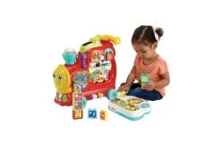 Speel met de 13 dubbelzijdige blokken, plaats ze in de sensor en leer letters, letterklanken, dieren en meer! Druk op de 10 knipperende cijfertoetsen om kennis te maken met cijfers en verschillende plekken. Stop de blokjes in de magische tunnel om te leren tellen en luister naar de vrolijke melodietjes en gezongen liedjes terwijl je met de locomotief op avontuur gaat. Wordt inclusief 3 AA-batterijen geleverd in try-me verpakking. Geschikt voor kinderen vanaf 1 jaar.