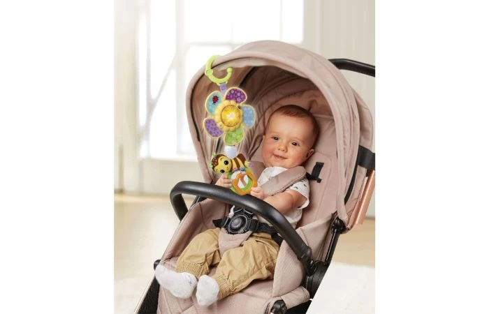 Trek aan de ring om de bloem te zien draaien en luister naar de vrolijke reacties van Zoemie de bij terwijl het lichtje knippert. De ring en het spiegeltje zijn speciaal gemaakt voor kleine handjes. Het gebruik van verschillende stoffen en texturen stimuleren de tastzin. Het speelgoed is eenvoudig te bevestigen aan bijvoorbeeld een kinderwagen of autostoeltje met behulp van de bevestigingsring. Terwijl het kind naar vrolijke reacties luistert, trekt het knipperende lichtje de aandacht. Met 15 melodietjes en 4 gezongen liedjes, Nederlands gesproken. Voorzien van automatische uitschakeling. Wordt inclusief 3 LR44 knoopcelbatterijen geleverd in try-me doos. Geschikt voor kinderen vanaf 3 maanden.