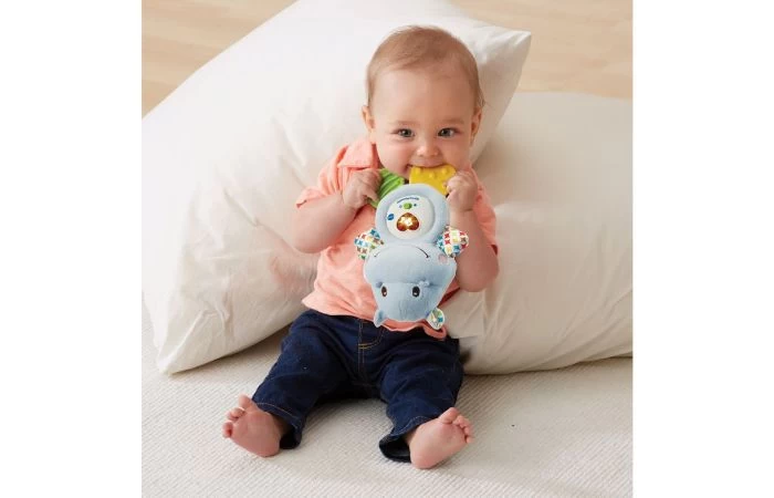 Druk op de knipperende hart-toets om grappige geluiden, vrolijke zinnetjes, gezongen liedjes en melodietjes te horen. Knuffel, knabbel en speel met mij! Met twee bijtringen: het veilige rubber met structuur verzacht de pijn bij het doorkomen van de tandjes. Knisperende pootjes en zacht pluche stimuleren de tastzin. Oppervlakte afwasbaar door verwijderbaar elektronisch onderdeel. 10 melodietjes en 3 gezongen liedjes. Met automatische uitschakeling. Wordt geleverd met 3 LR44-knoopcel batterijen in try-me verpakking. Is gemaakt van plastic, pluche en rubber en geschikt voor kinderen van 0 tot 24 maanden.