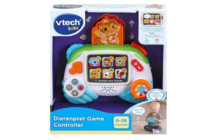 Speel vrolijke spelletjes om kennis te maken met het alfabet, tellen, dierengeluiden, rijmwoorden en meer! Druk op de kiekeboe-toets om een kiekeboe-spelletje te spelen met de tijger. De VTech dierenpret game controller is gemaakt van plastic en wordt geleverd inclusief 2 AAA-batterijen in try-me verpakking. Is geschikt voor kinderen vanaf 9 maanden.